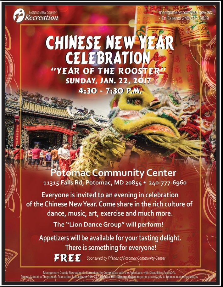 WHEN Sunday, January 22, 2017, 4:30 – 7:30pm WHERE Potomac Community Recreation Center 11315 Falls Road Potomac, MD 20854 CATEGORY Community Events, Parks & Recreation AGE Family AREA Bethesda/Chevy Chase CONTACT PHONE 240-777-6960 COST Free/Gratis DETAILS Everyone is invited to celebrate the “Year of the Rooster”. Come share in the rich culture of dance, music, art, exercise and much more. The “Lion Dance Group” will perform. Appetizers will be available for your tasting delight. Sponsored by the Friends of Potomac Community Center. Free/Gratis LINK www.montgomerycountymd.gov…